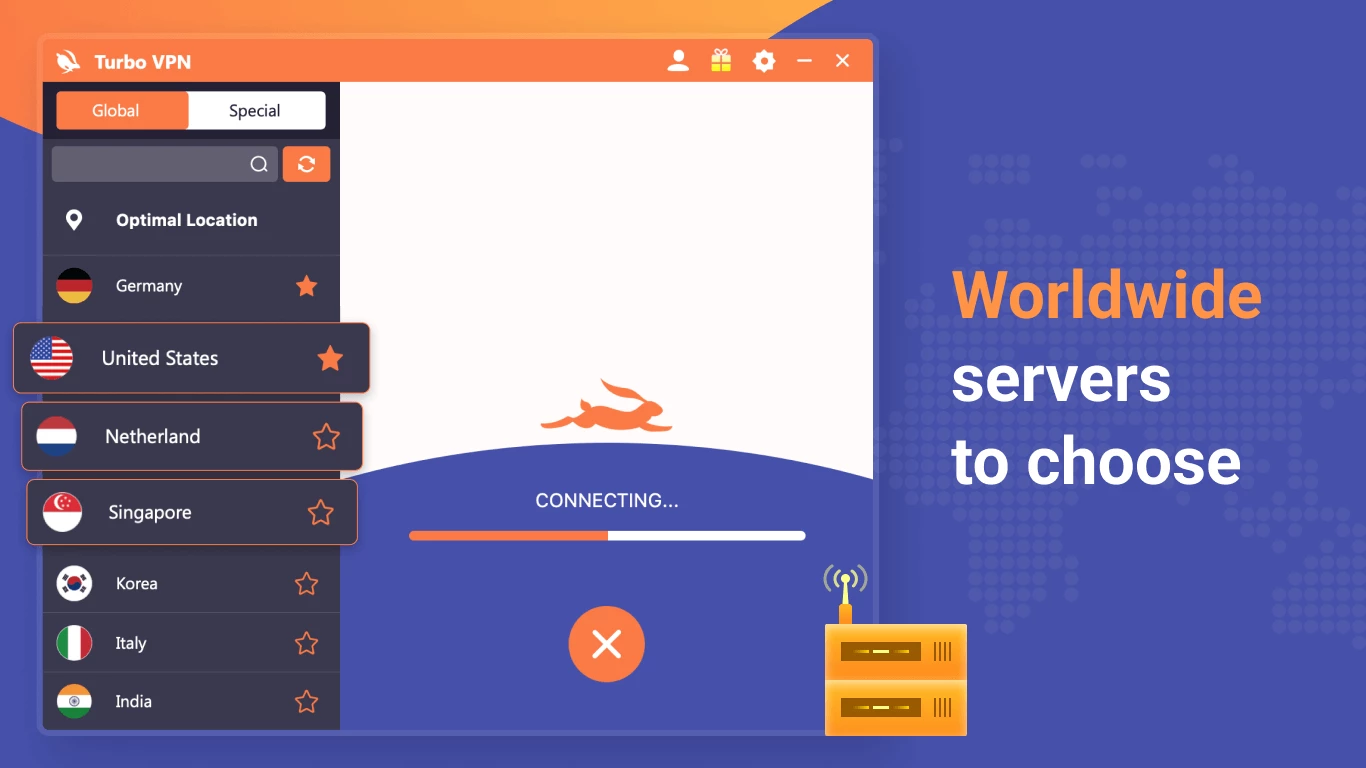 Turbo VPN،مثله كمثل شبكات VPN الأخرى،يستخدم شبكة Wi-Fi أو بيانات الهاتف المحمولويوفر خوادم غير محدودة في منطقتنا لالتقاط موقعنا المفضل في غضون ثوانٍ. إنه تطبيق يعمل بنظام Android، ولكن يمكنك تنزيله على جهاز الكمبيوتر الخاص بك أيضًا.